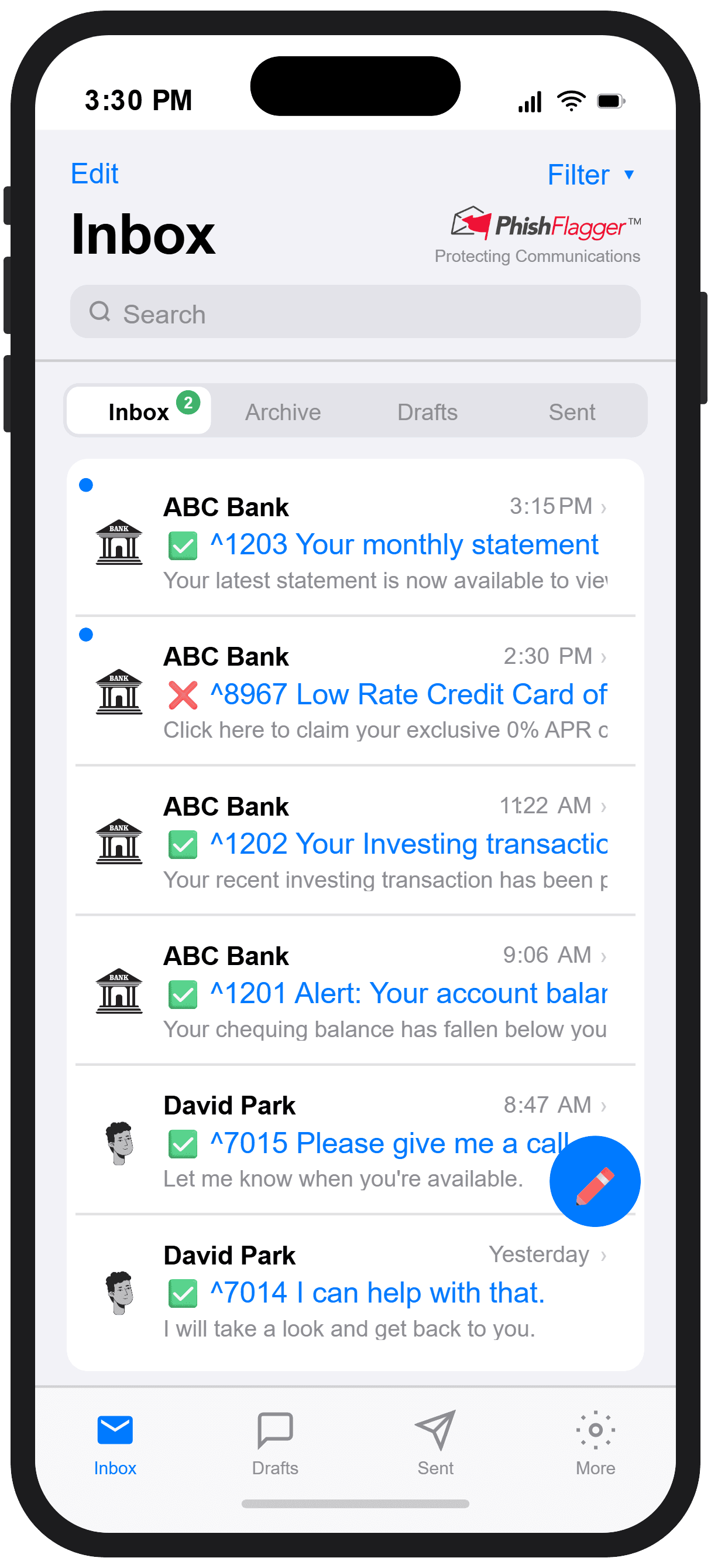 Phishing scams and fraudulent emails hurt everybody. Today it is still far too easy to open an email that looks legitimate on the surface but hides malicious risks inside. For bulk email senders (banks, insurance companies, financial institutions, and businesses that regularly send emails to customers), getting people to open their emails is critical to sales and extending the lifetime value of a customer. PhishFlagger™ email numbering is a patented, licensable email safeguard to help prevent your email contacts from phishing and fraud. PhishFlagger™ prevents your contacts from being fooled by fraudulent emails that may be claiming or even appearing to be from you. With PhishFlagger™ email numbering, you can give your clients confidence that emails they receive from you are authentic and safe to open. Help protect your customer base from phishing and assure them that you take their privacy and safety seriously.